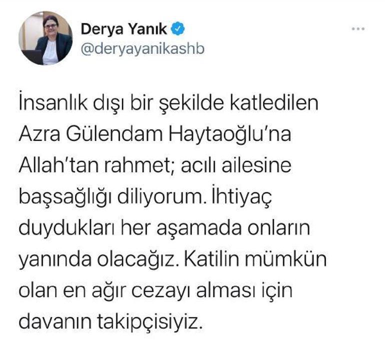 Yanık, i̇nsanlık dışı bir şekilde katledilen azra gülendam haytaoğlu'na allah'tan rahmet, acılı ailesine başsağlığı diliyorum. Antalya'da kaybolan üniversite öğrencisi azra gülendam haytaoğlu'nun cansız bedeni bulundu. .i̇letişim fakültesi gazetecilik bölümü öğrencisi olan azra gülendam haytaoğlu'nun cinayet haberi tüm türkiye'yi yasa boğdu. İhtiyaç duydukları her aşamada onların yanında olacağız. Haytaoğlu'nun cinayete kurban gitmesine kadın örgütleri tepki gösterdi.